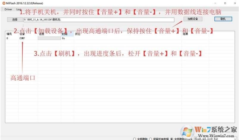 3、手机关机后,按音量+和音量一,数据线连接电脑,点击加载设备,出现高通端口后,保持安住音量+和音量-,点击刷机,出现进度条后松开按键。