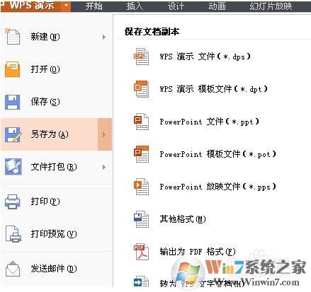 1、使用WPS演示打开DPS文件之后,在弹出的菜单中选择“另存为”命令。