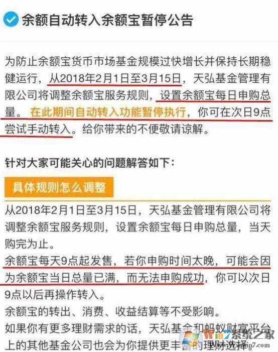 1. 从2月1日到3月15日,余额宝每天限额,早上九点开始发售,一般半个小时左右就会被抢空。2. 暂停自动转入,预约要手动进行。3. 每天限量不确定,具体是多少,连天弘基金自己都不知道。
