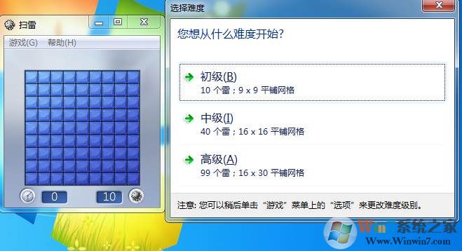 2、初次打开,会让你选择难度,难度越高,格子越多,雷也就越多。初学者可以选个初级,小编已经是高手了,选个中级吧。