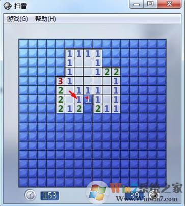 4、点击 重新开始这个游戏,重来。怎么样,这次没炸吧!,这时我们看到出现了很多数字,显示1,说明 以“1”为中心9个格子内有一个是地雷,显示2就表示有两个,以此类推;