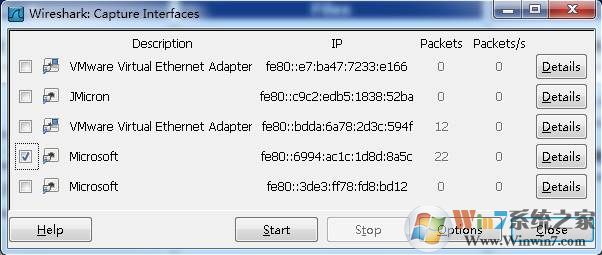 点击Caputre->Interfaces.. 出现下面对话框,选择正确的网卡。然后点击"Start"按钮, 开始抓包