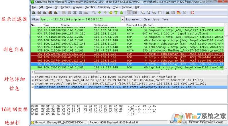 比如 ip.src ==192.168.1.102 显示源地址为192.168.1.102,