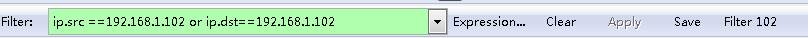 | ip.src ==192.168.1.102 or ip.dst==192.168.1.102 | 源地址或者目标地址是192.168.1.102 |