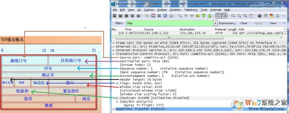 从下图可以看到wireshark捕获到的TCP包中的每个字段。