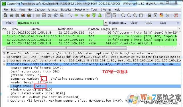 图中可以看到wireshark截获到了三次握手的三个数据包。第四个包才是HTTP的, 这说明HTTP的确是使用TCP建立连接的。