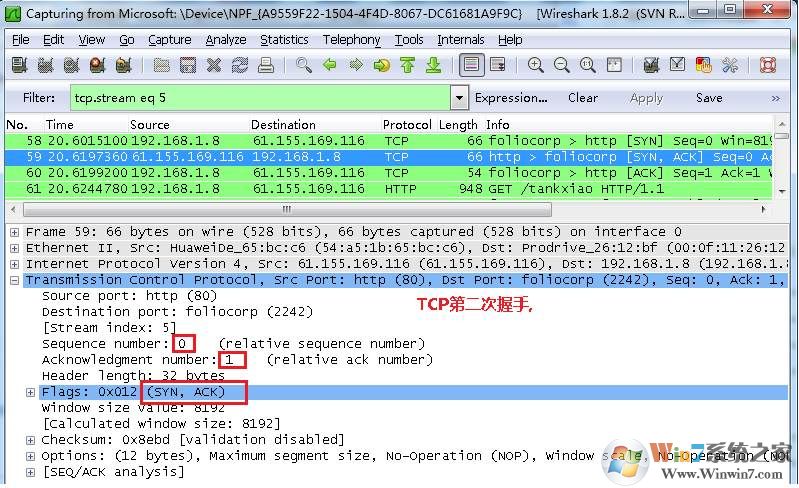 服务器发回确认包, 标志位为 SYN,ACK. 将确认序号(Acknowledgement Number)设置为客户的I S N加1以.即0+1=1, 如下图