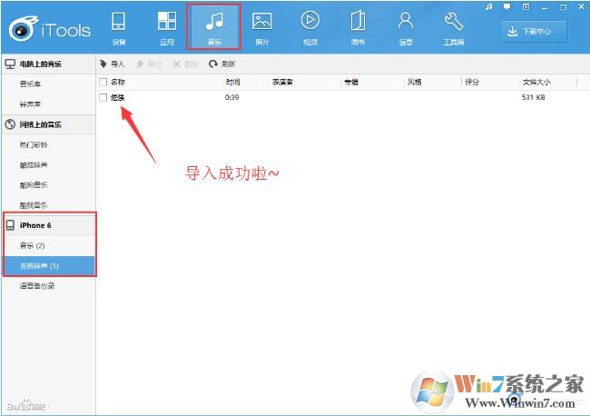 一、铃声导入成功后,即可在iTools(电脑端)>>音乐>>设备>>系统铃声列表中查看到