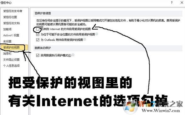 3、打开信任中心设置界面后把受保护的视图里的有关Internet的选项勾掉,点击确定之后关闭目前文档重新打开即可,如下图所示: