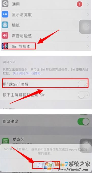 1.首先我们打开手机系统设置,找到siri与搜索,打开用“嘿siri”唤醒开关。点击启用,然后会弹出设置“嘿siri”,如图: