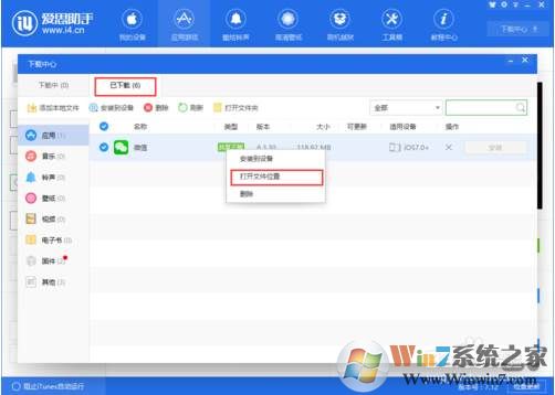 2、打开右上角“下载中心”等待下载完成,在已下载里面找到刚才下载的微信,右键点击“打开文件位置”,见到微信的安装包;