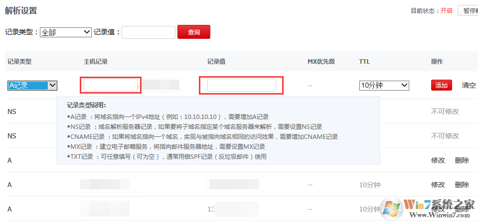 2、然后,选择记录类型、主机记录 填写 二级域名 的头部如 www soft 等,自定义,记录值 填写解析到的服务器 IP地址,然后点击添加。