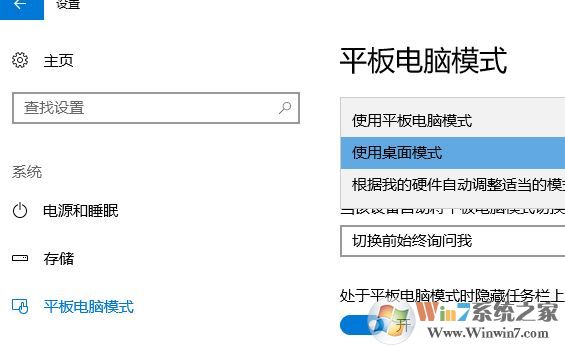 4、在左侧点击 平板电脑模式 ,在右侧“当我登录时” 的下拉菜单中选择“使用桌面模式”‘