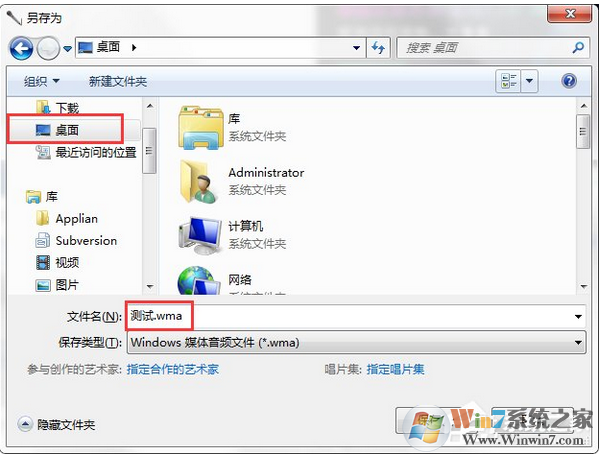 4、在弹出的“另存为”对话框中,选择要保存测试录音文件的路径,比如“桌面”,起好文件名,比如“测试.wma”,然后点击“保存”。如图: