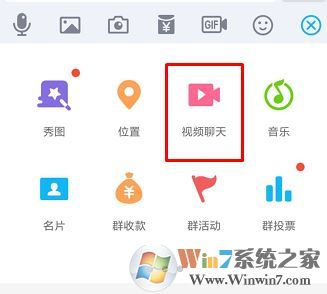 2、点击打开+ 号后我们可以看到QQ电话、视频电话、文件、句有料、发红包 定位等等选项,我们直接翻到第二页,点击打开“视频聊天”按钮;