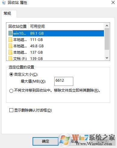 5、右击“回收站”,选择“属性”,在打开的“回收站属性”对话框中,将各分区都设置为“不将文件移动到回收站中……”,点击“确定”;