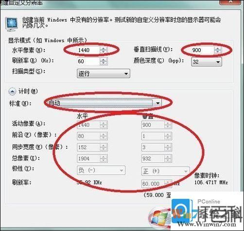 5、水平像素 添加1440 垂直扫描线 添加900。标准 选择GTF后改回自动 然后点击测试 然后 重新打开更改分辨率 你会发现1440*900已经有了。