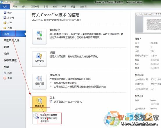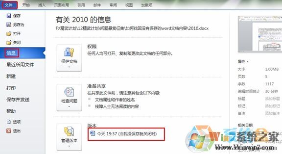 2、单击:文件--信息--找到右边“版本”如下图的一个文件版本,单击这个版本即可,按照图示操作即可: 点击未保存的文档即可恢复文档。