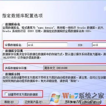 6、SID和全局数据库名建议一致,建议保持默认;数据库字符集默认是GBK,用户可以通过下拉菜单选择其它字符集格式。如果勾选“创建带样本方案的数据库”oracle安装后会在数据库里生成一个测试用的样本数据,初学者可用该样本数据学习sql。该设置是否勾选不影响后续安装。