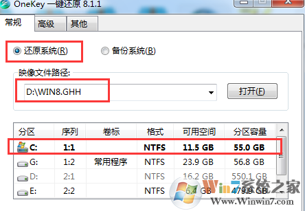 2、我们再双击打开Onekey Ghost 软件,选择“还原系统”,选择win8.GHH(一般都会自动获取),然后选择C盘,并点击确定;
