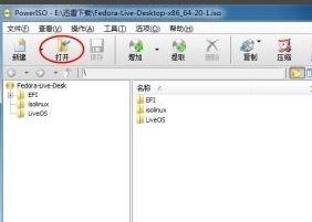 2、打开安装完成后的PowerISO,在软件菜单栏中点击打开,加载Fedora镜像,如图: