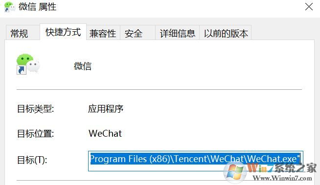 先在微信的桌面快捷方式上用“鼠标右键-属性”确定下目标位置。像小编的目标位置是"D:\Program Files (x86)\Tencent\WeChat\WeChat.exe",如图:
