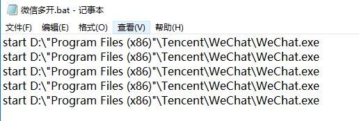 然后新建个文本文档,然后把目标的位置粘贴进去,并简单修改下,给Program Files (x86)加上英文半角的双引号,喏,就是下面这样。至于想要开几个微信,就贴几行。