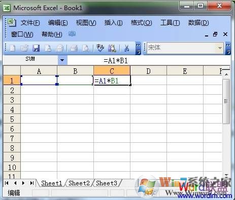 ②输入完毕以后,我们会发现在 C1 单元格中会显示“0”,当然了,因为现在还没有输入要相乘的数据嘛,自然会显示0了。