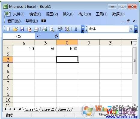 ③现在我们在“A1”和“B1”单元格中输入需要相乘的数据来进行求积,如下图,我分别在A1和B1单元格中输入10和50进行相乘,结果在C1中就会显示出来,等于“500”。
