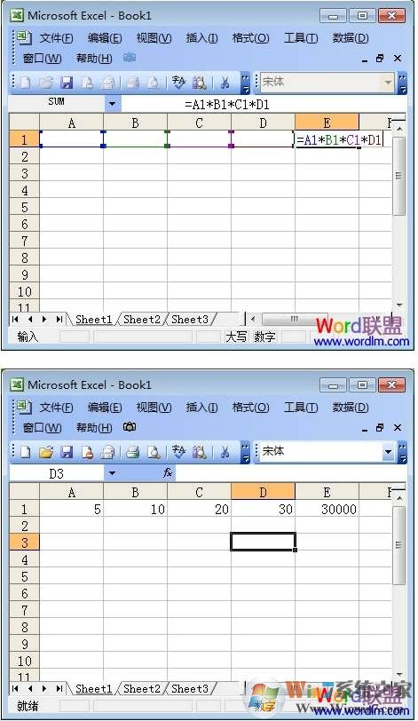 2、两个以上单元格数值相乘,同理也是在E1单元格中输入乘法公式“=A1*B1*C1*D1”。