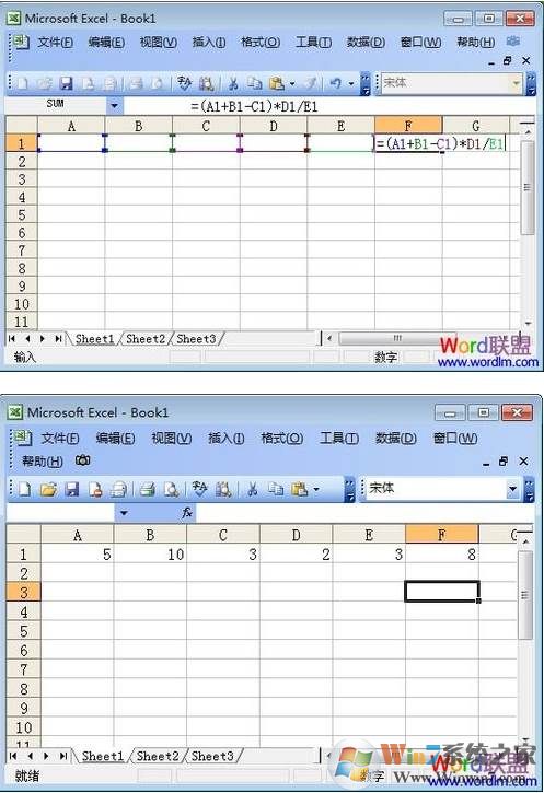 ②好了,知道公式了,我们是不是应该马上来在Excel中的“F1”中输入“=(A1+B1-C1)*D1/E1”。