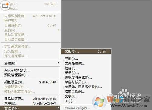 1、打开ps软件,点击菜单栏上的“编辑”——首选项——常规;