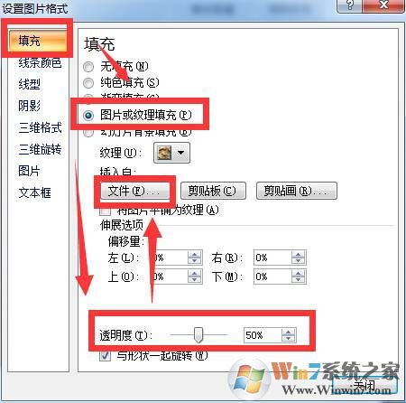 3、勾选“填充”里的“图片或纹理填充”,再将透明度的滑块调到50%,再点击“文件”;