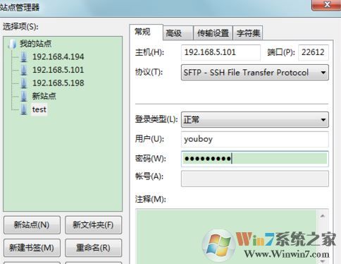 2、在站点管理器界面新建站点,填写主机、端口,选择正确的协议,登录类型选正常,再填写用户名、密码,再点击“连接”,见下图:
