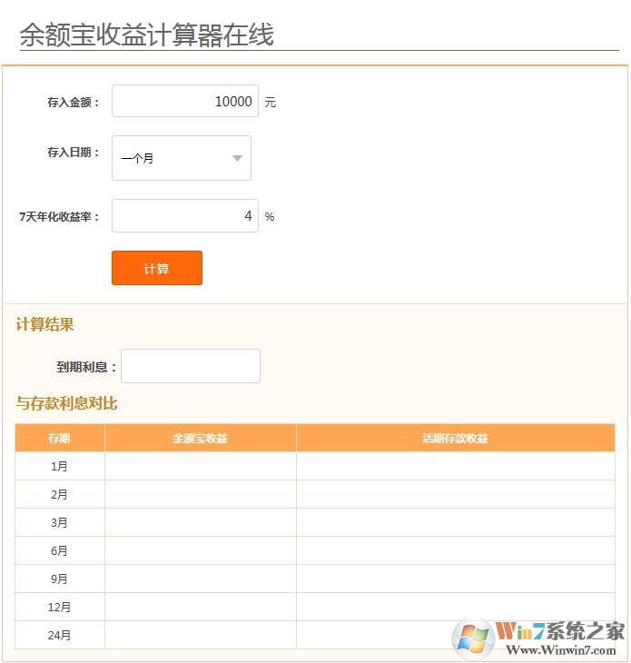 输入数值,然后点击计算即可。除了计算出1月到24个月的收益之外还和银行活期有一个鲜明的对比。