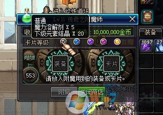 3、我们将需要附魔的装备放到包中,然后点击打开附魔师的商店,将装备和对应部位的卡片放上,点击即可进行附魔,附魔高级卡片需要消耗材料,如:最上级元素结晶,这些东西在拍卖行都是随时可以买到的,点击附魔后 卡片就消失了,我们的装备上就出现了卡片的属性!