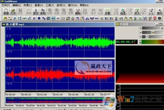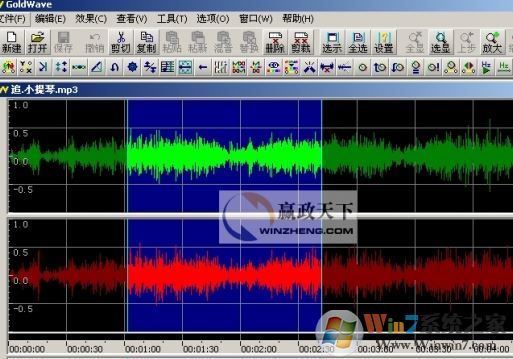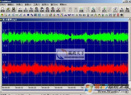 4、我们打开的是一个立体声文件,所以GoldWave会分别显示两个声道的波形,绿色部分代表左声道,红色部分代表右声道,主界面最下方的状态栏是当前音频文件的一些状态,比如时间、频率等;
