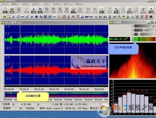 5、我们点击右边的控制器中的“播放”按钮开始播放此时就可以看到主界面中会有一条平移的灰线,这个代表当前播放的位置,在控制器中可以看到具体的波形,以及左右声道的音量等信,如图: