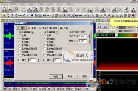 比如第1项,播放设置,可以定义这个按钮播放全部波形、选定部分的波形、未选部分的波形、在窗口中显示出来的部分波形等等,另外可以调整快进和倒带的速度哦;