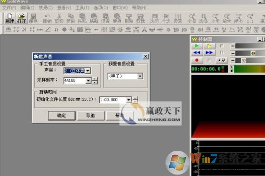 1、点击主界面左上角的“新建”,新建一个音频文件,在弹出的对话框里面,我们可以设置一些新建音频文件的参数,例如声道、采样频率,音频文件的长度等等;