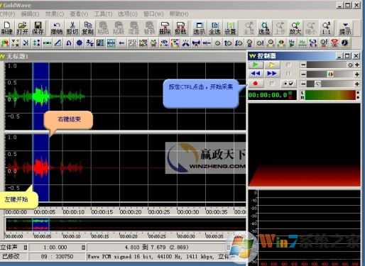 3、按住ctrl键,点击控制器上的红色圆点(录音键)开始采集录制完一段声音后,可以选定一部分进行编辑,方法是,鼠标左键确定开始点,鼠标右键确定终点;