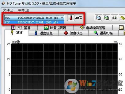 1、HDTune使用方法很简单,打开HDTune硬盘检测工具后我们可以选择硬盘,在主界面就可以看到硬盘的温度,如图: