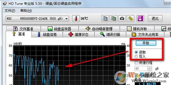 2、在HDTune硬盘检测工具右侧选择读取或者写入,然后点击开始可以测试硬盘的读取和写入速度,如图: