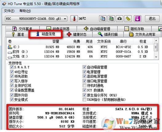 3、在HDTune硬盘检测工具的磁盘信息中我们可以看到自己硬盘的固件版本、序列号、容量以及转速等等,买电脑时可以用来测试,免得被导购骗。,见下图: