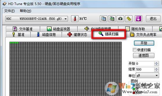 5、点击HDTune硬盘检测工具中的错误扫描,我们来看一下硬盘中是否存在损坏的块。