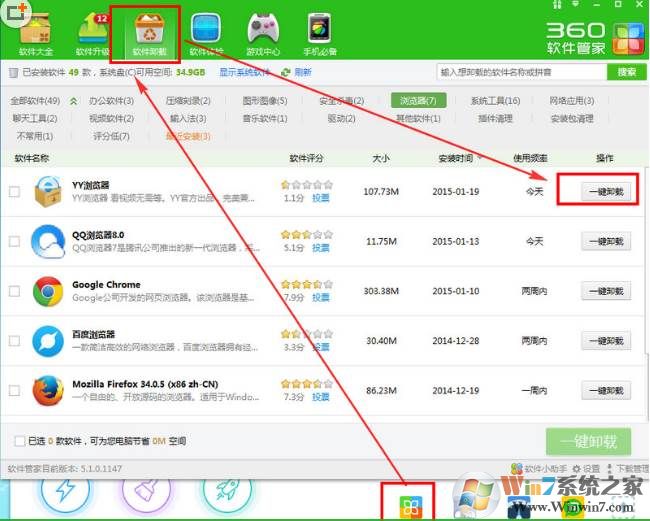 方法一:首先安装了360安全卫士的朋友可以在“软件管家”中点击“软件卸载”===“一键卸载”