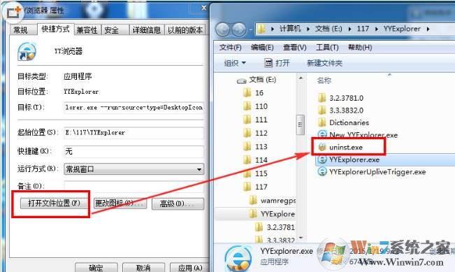 方法三:我们右击yy浏览器图标==“属性”==“打开文件位置”==点击“uninst.exe”