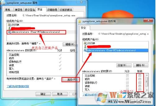 3、在YY浏览器的安装程序上右键点击“属性”并转到“安全”选项卡。然后点击高级,把权限全设置为拒绝。