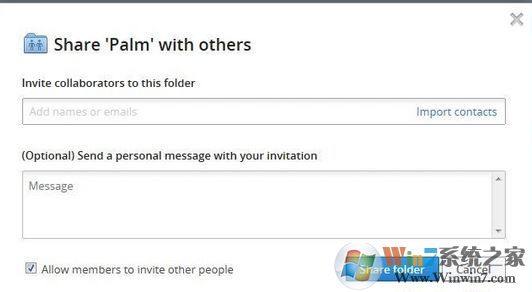 3、如果选择共享现有的文件夹,点下一步会让你选择Dropbox上已经有的文件夹,选好后,下一步就是邀请朋友来共享这个文件夹了,可以直接输入邮箱地址,也可以导入你邮箱的联系人来发出邀请,如图: