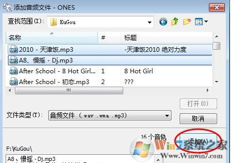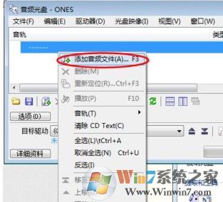 2、在窗口中空白区域点击鼠标右键,选择添加音频文件,弹出对话框,选择准备刻录的MP3歌曲,点击 添加 按钮,如图: